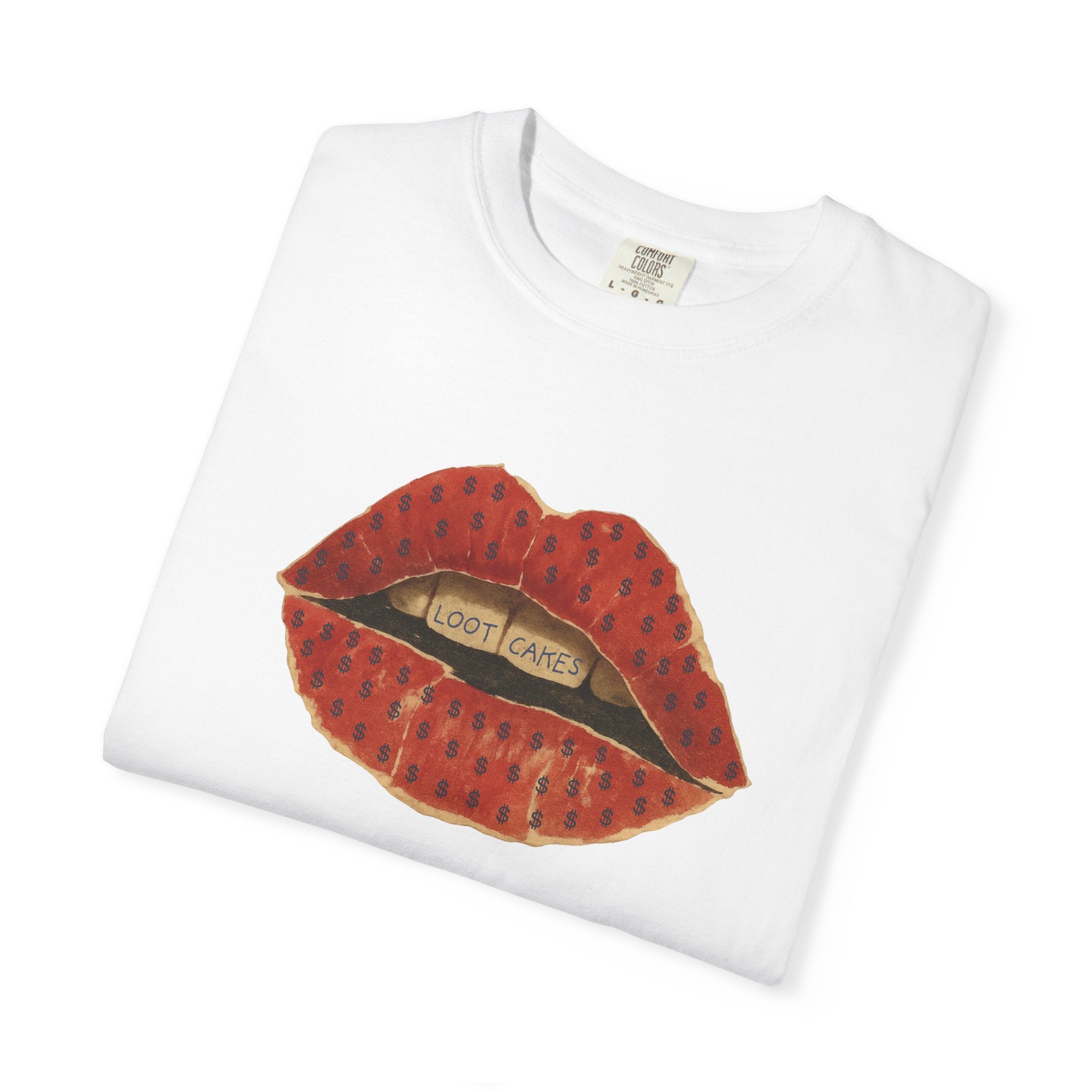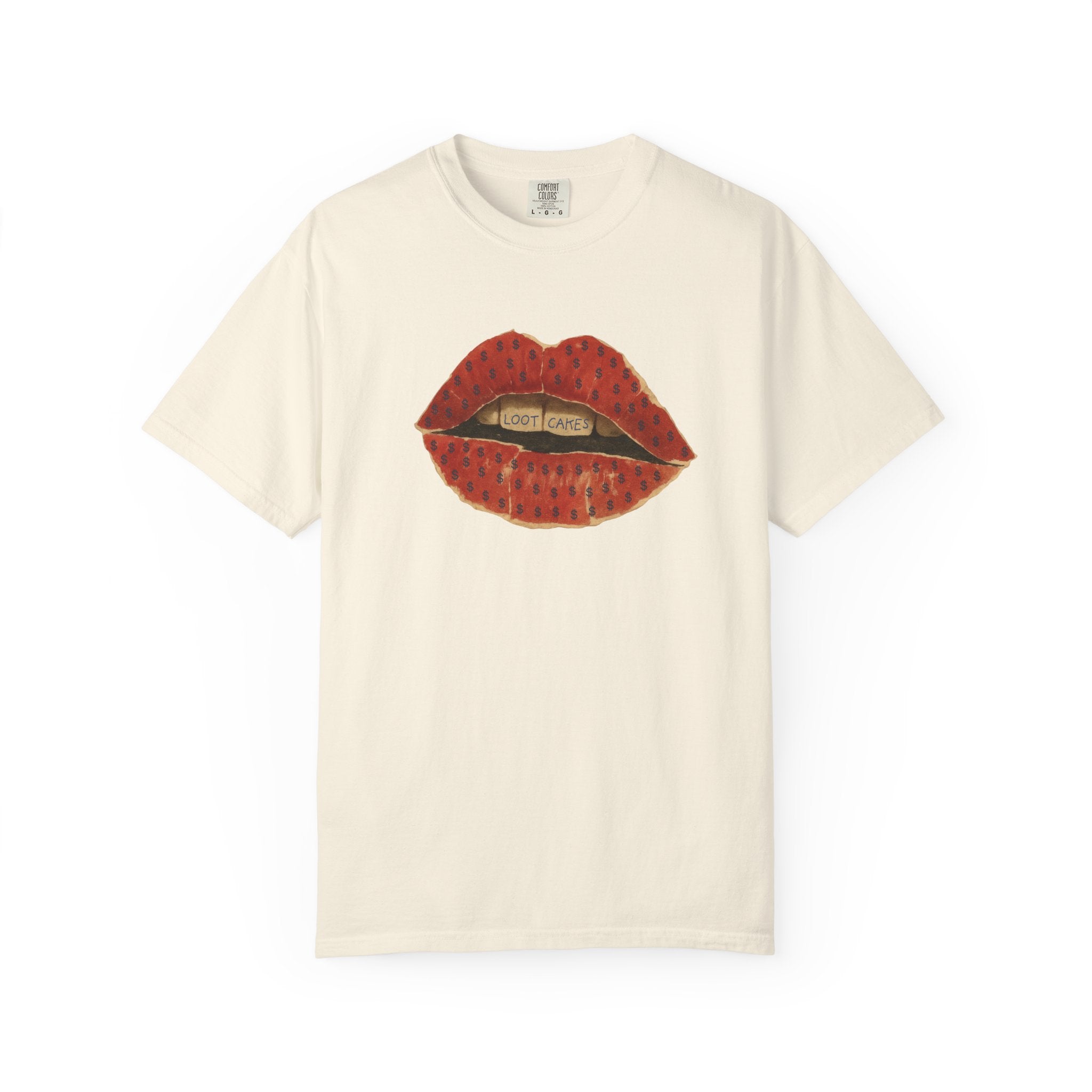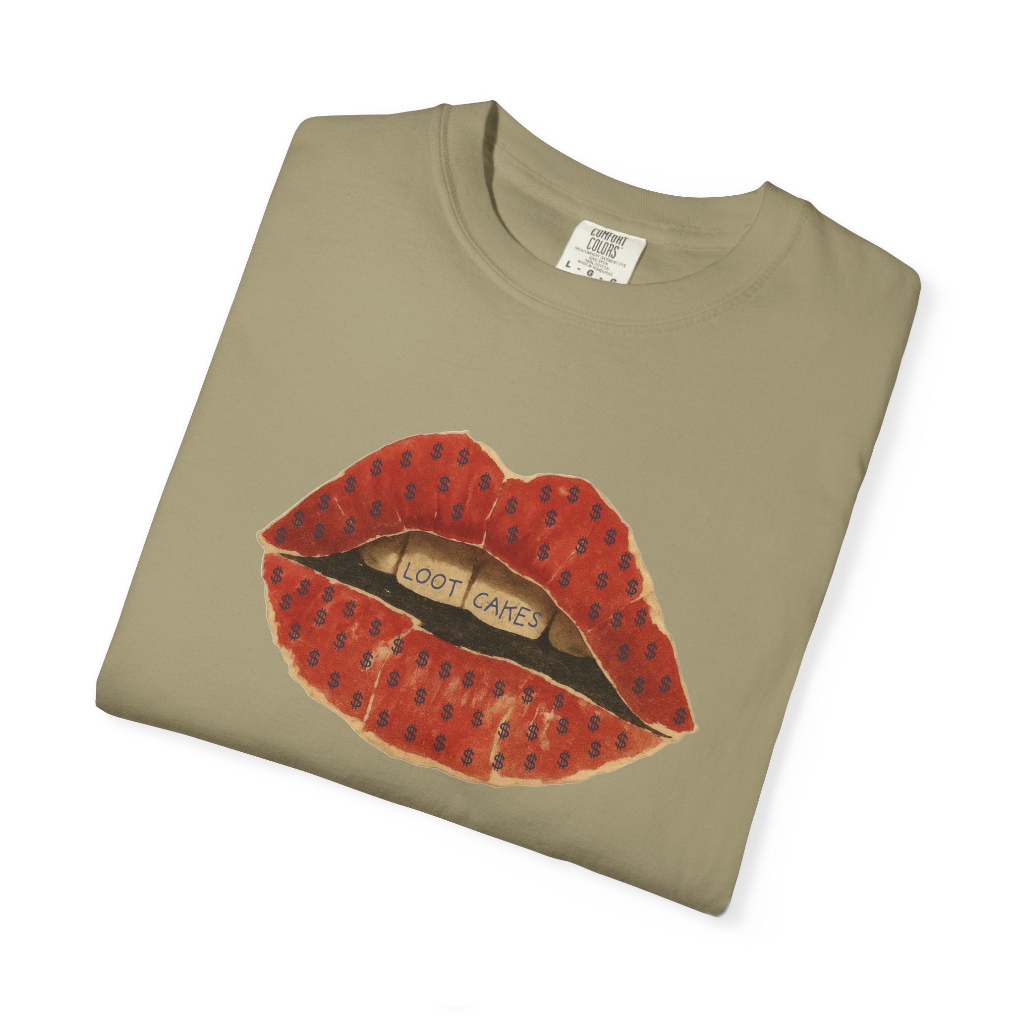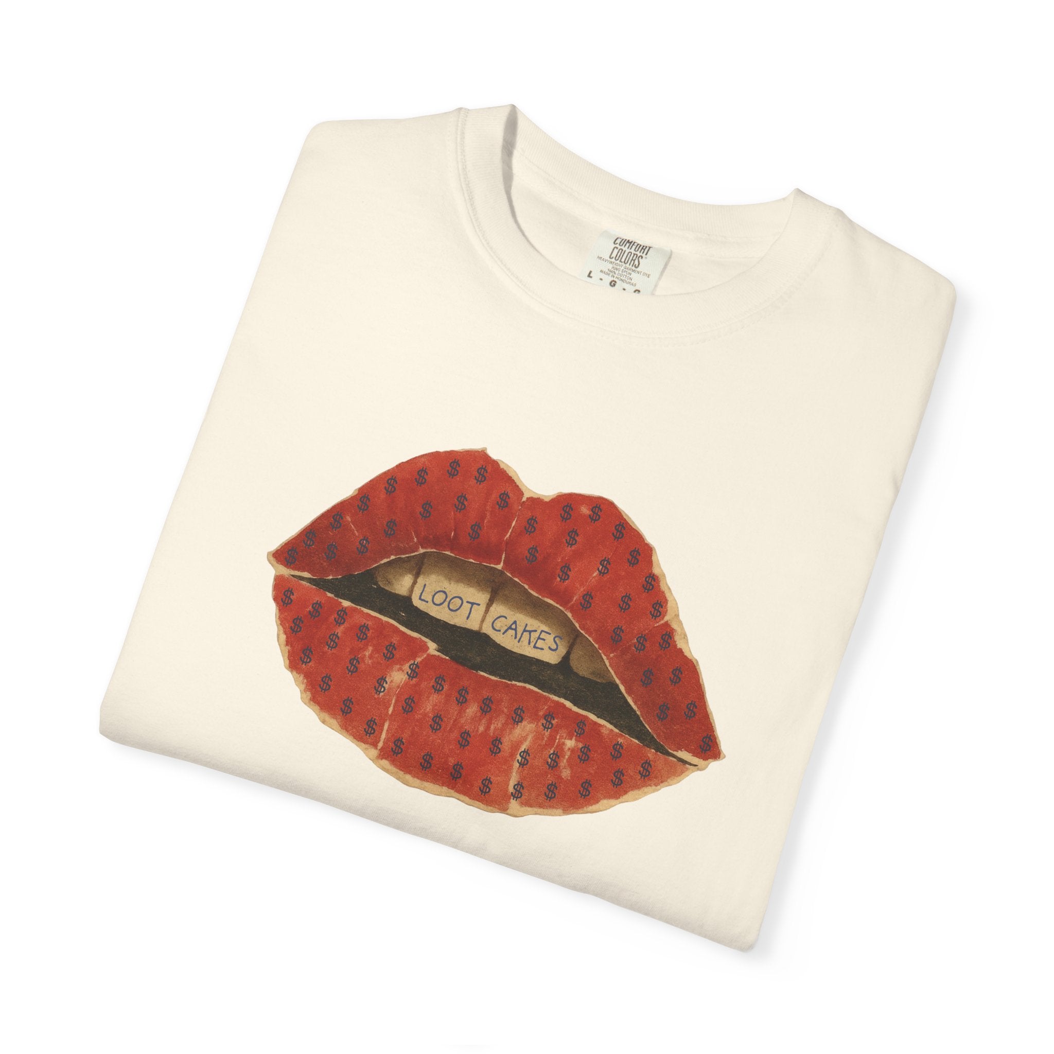 This piece gets straight to it: bold, vintage lips with “Loot Cakes” tucked between the teeth — a wink at desire, temptation, value, and the rewards you earn by staying real. A little seductive, a little dangerous, very Gen X energy. Not curated. Not polished. Just honest.