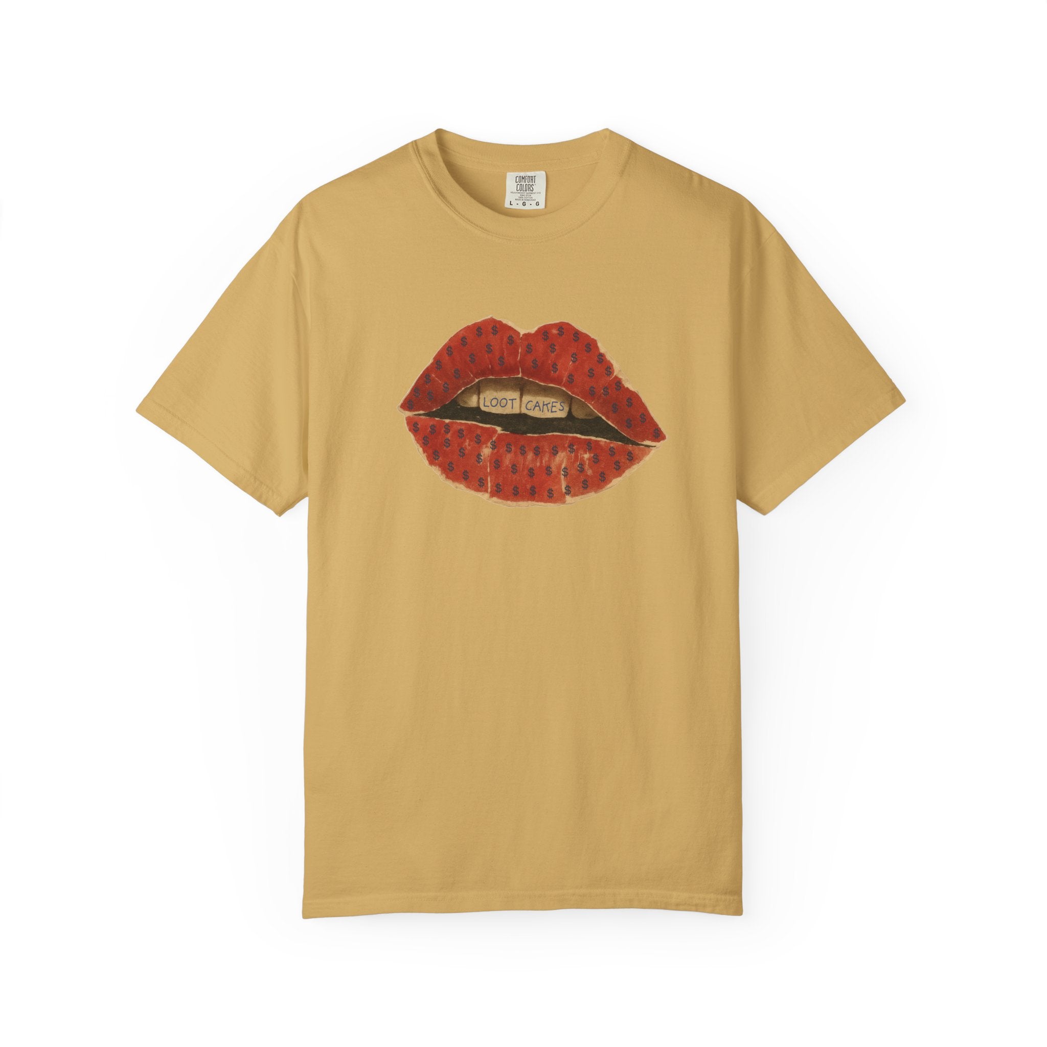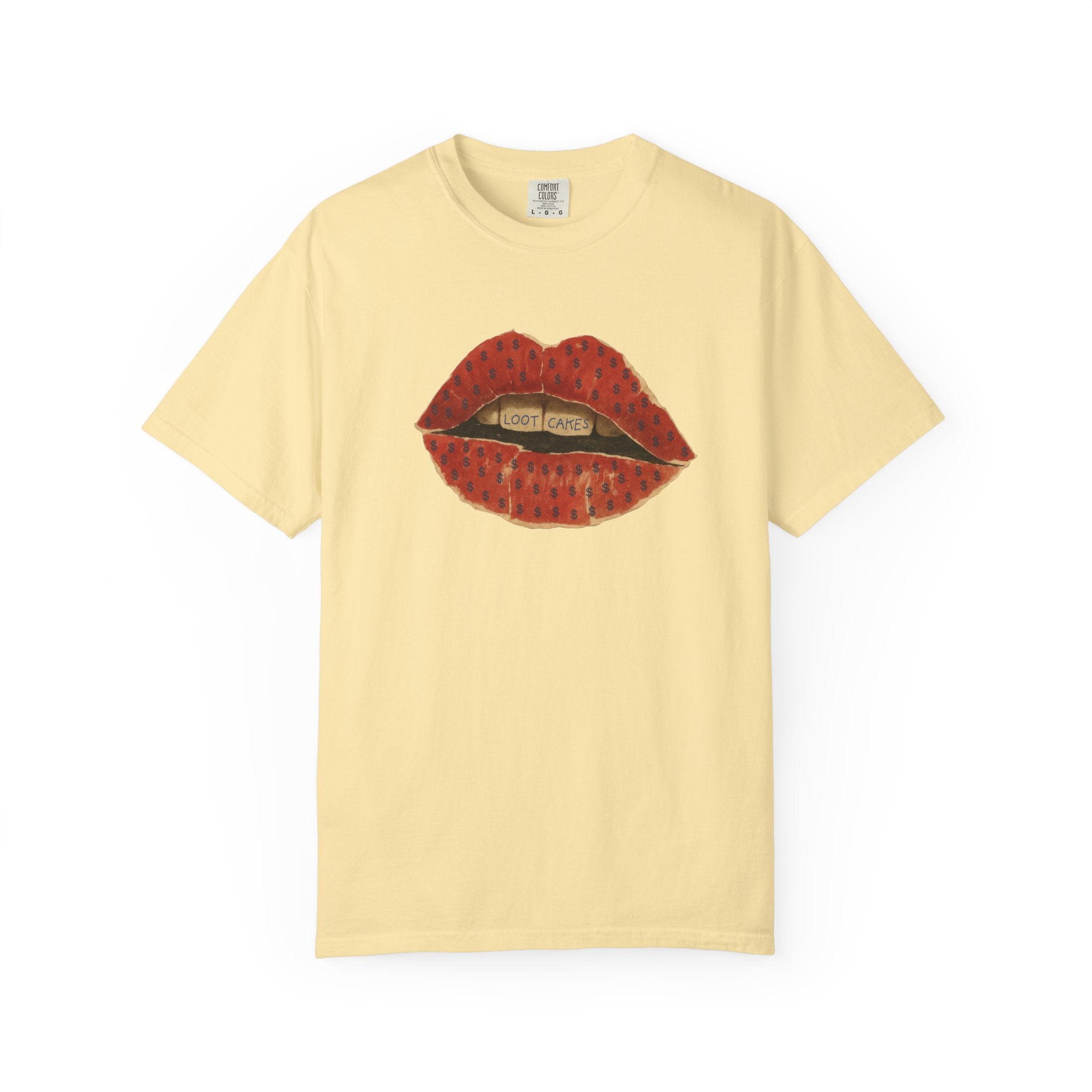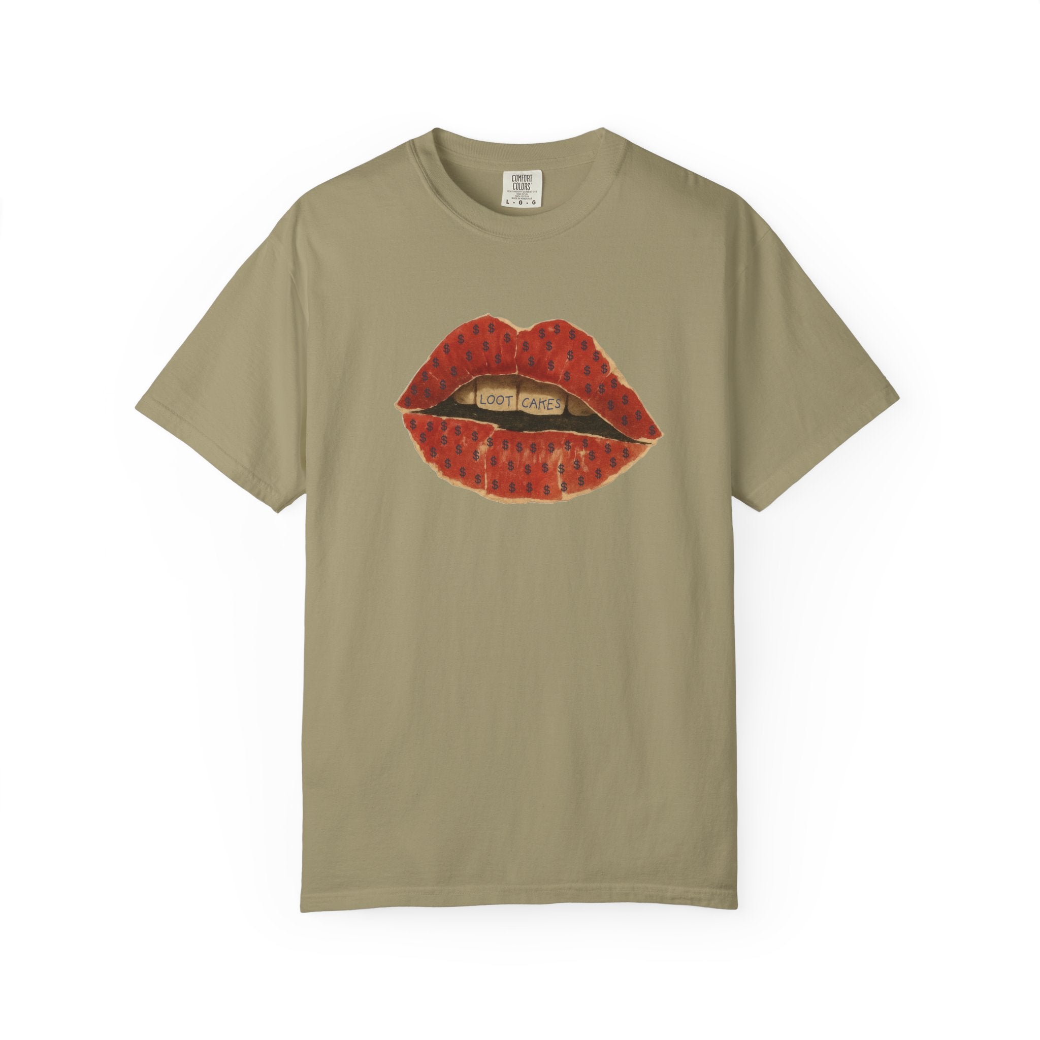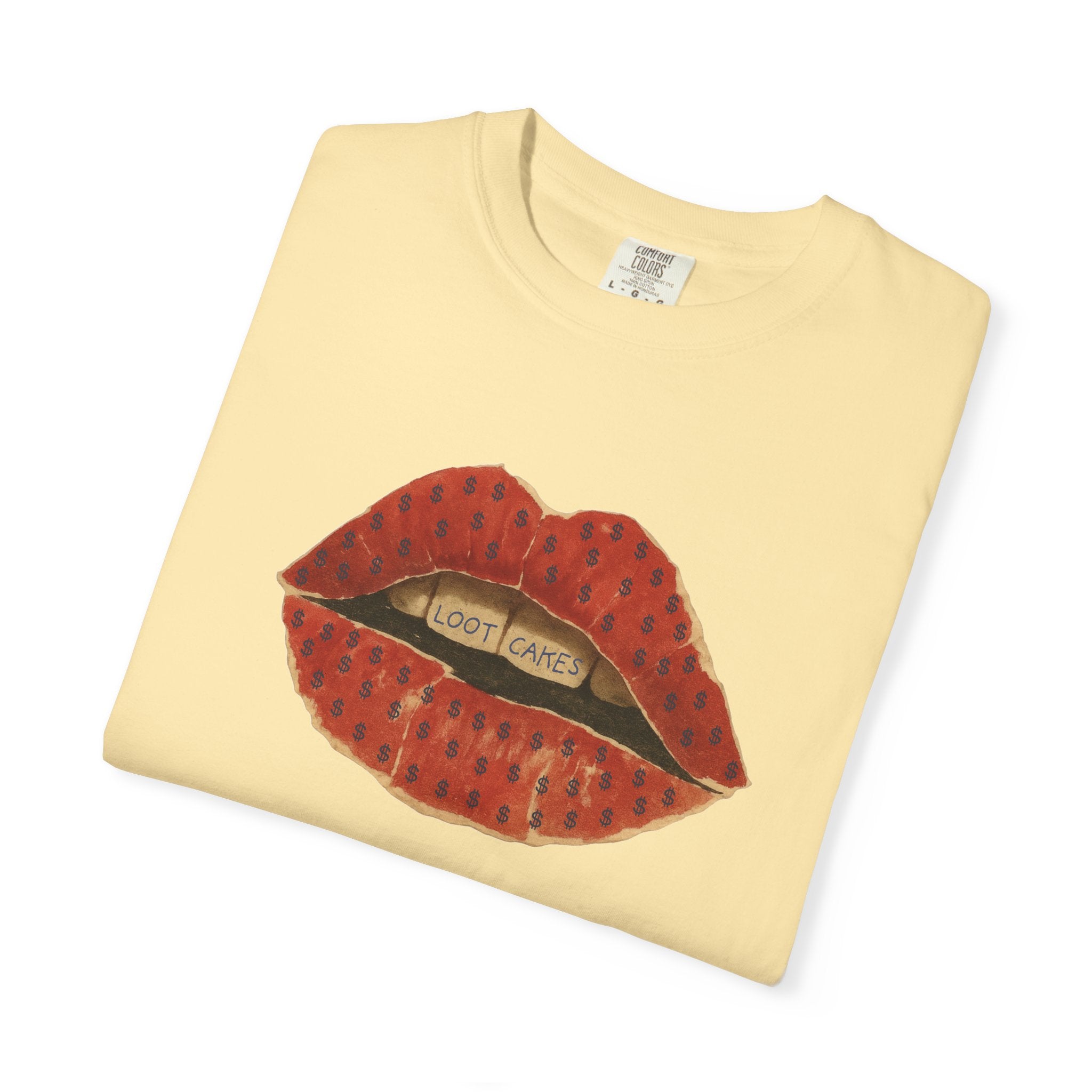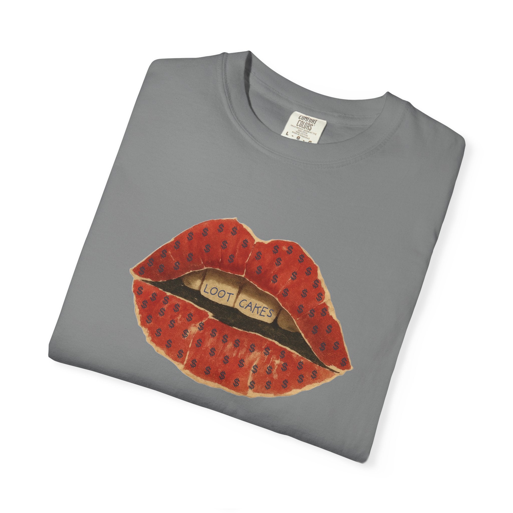 This piece gets straight to it: bold, vintage lips with “Loot Cakes” tucked between the teeth — a wink at desire, temptation, value, and the rewards you earn by staying real. A little seductive, a little dangerous, very Gen X energy. Not curated. Not polished. Just honest.