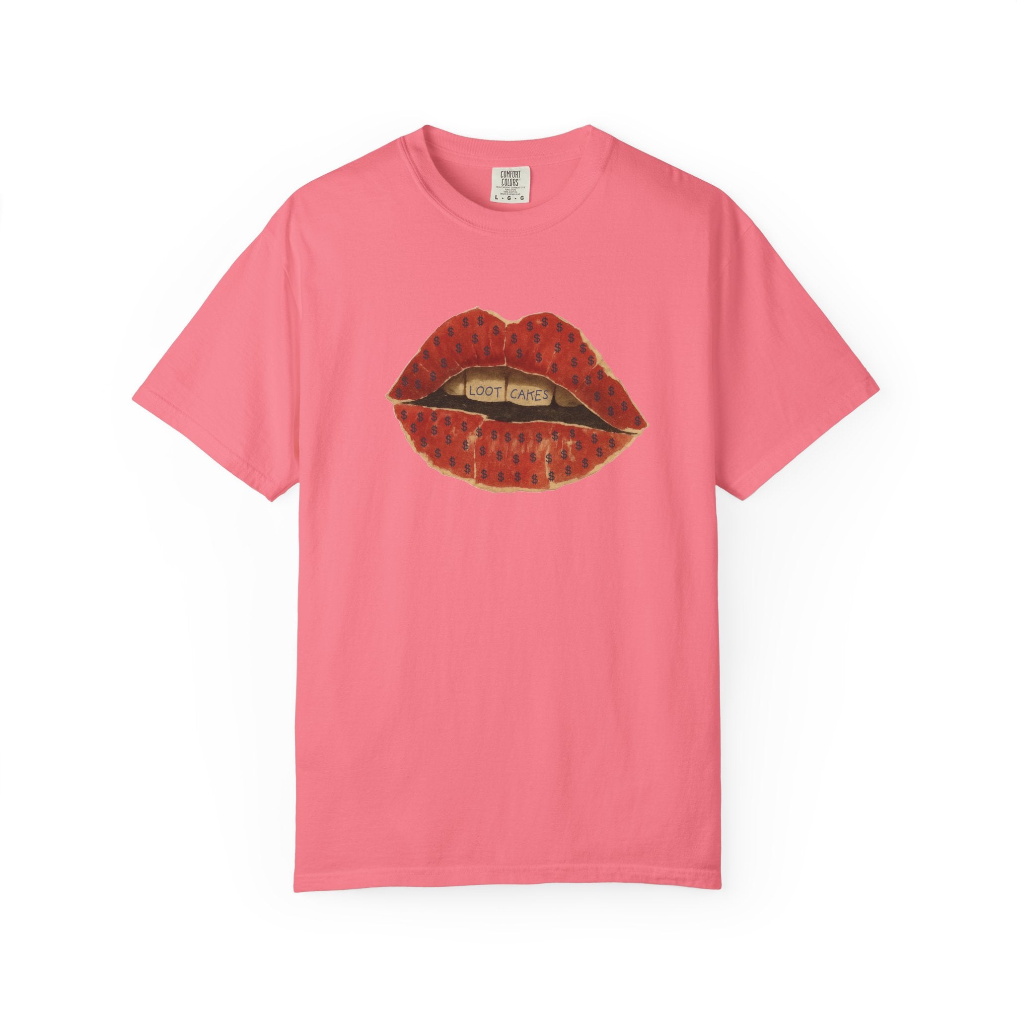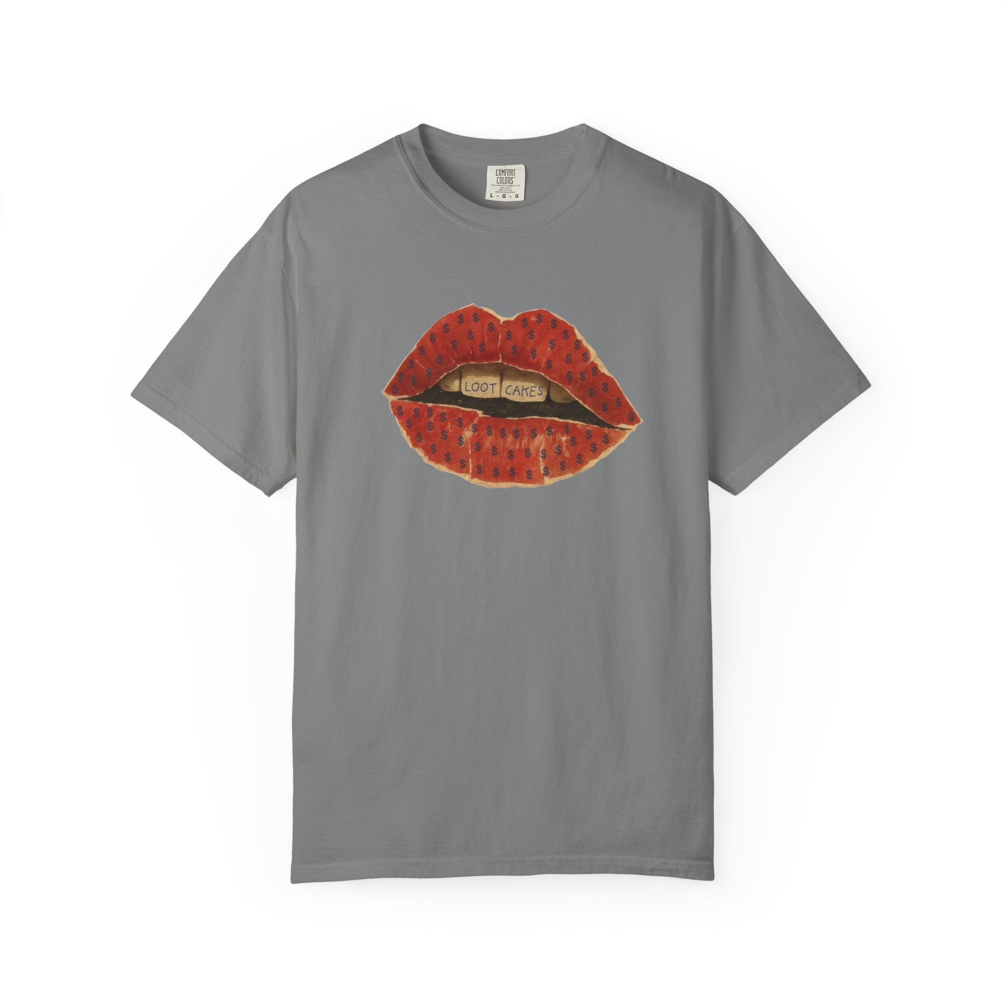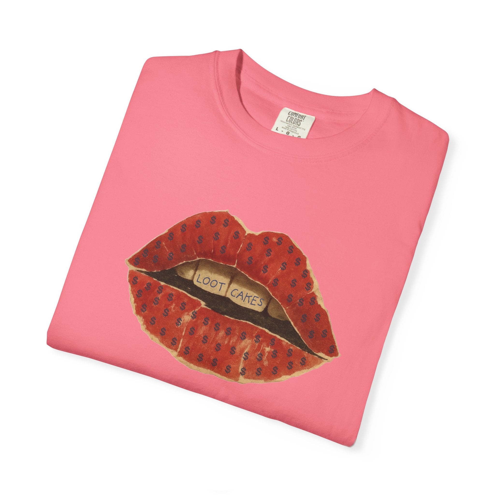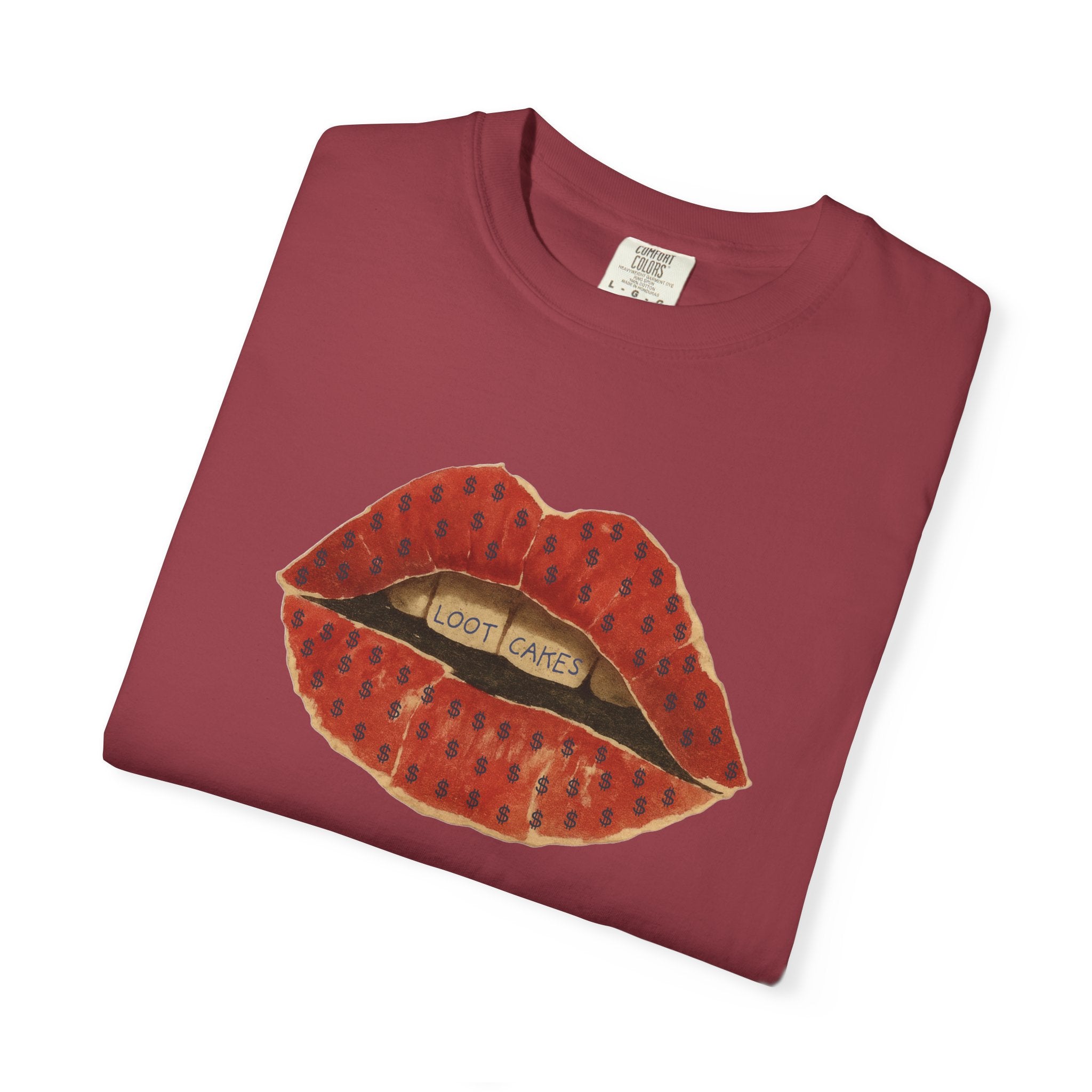 This piece gets straight to it: bold, vintage lips with “Loot Cakes” tucked between the teeth — a wink at desire, temptation, value, and the rewards you earn by staying real. A little seductive, a little dangerous, very Gen X energy. Not curated. Not polished. Just honest.