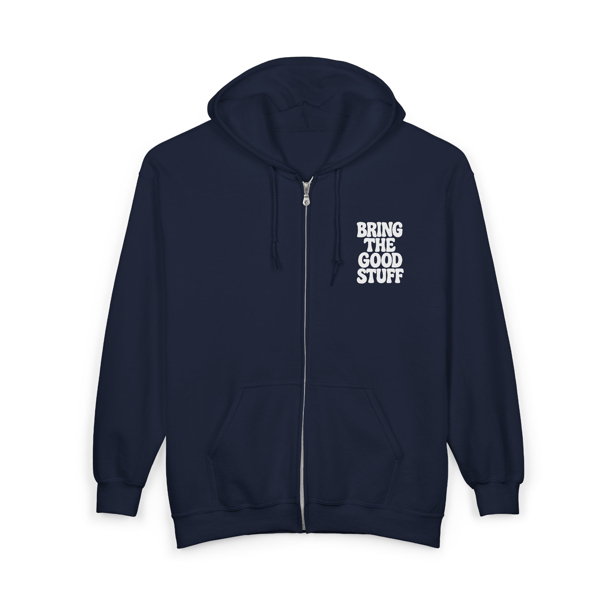 The small embroidered “BRING THE GOOD STUFF” on the chest says everything without yelling. It’s not a slogan — it’s a reminder. This hoodie wears easy, lives hard, and feels better the longer you have it.