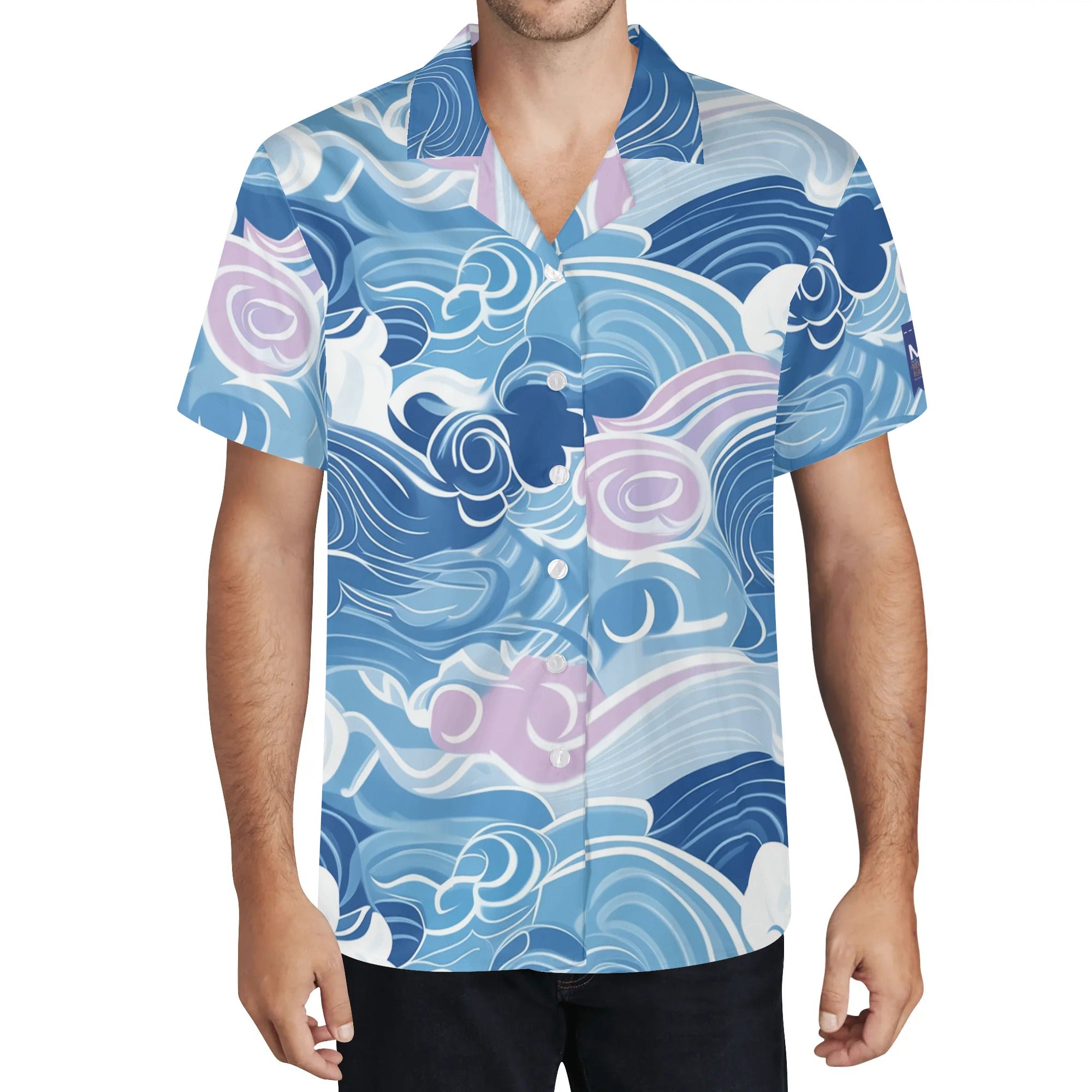 Cool Dad Collection: Men’s Blue Waves Short Sleeve Button Down Shirt with Cuban Collar