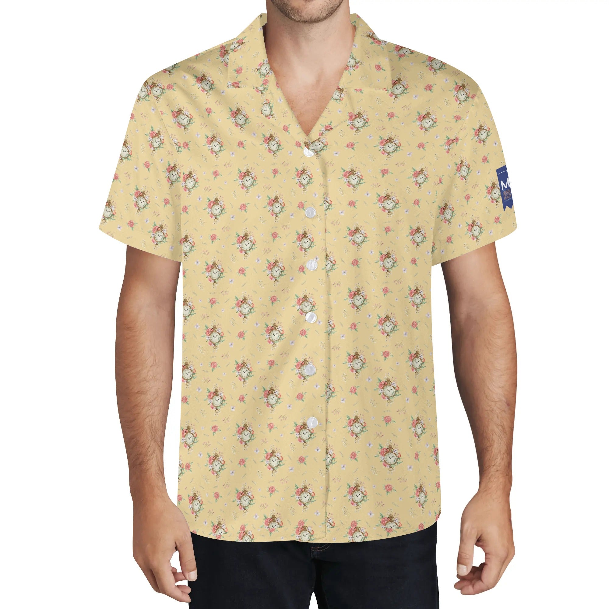 Cool Dad Collection: Men’s Yellow Clocks & Roses Short Sleeve Button Down Shirt with Cuban Collar