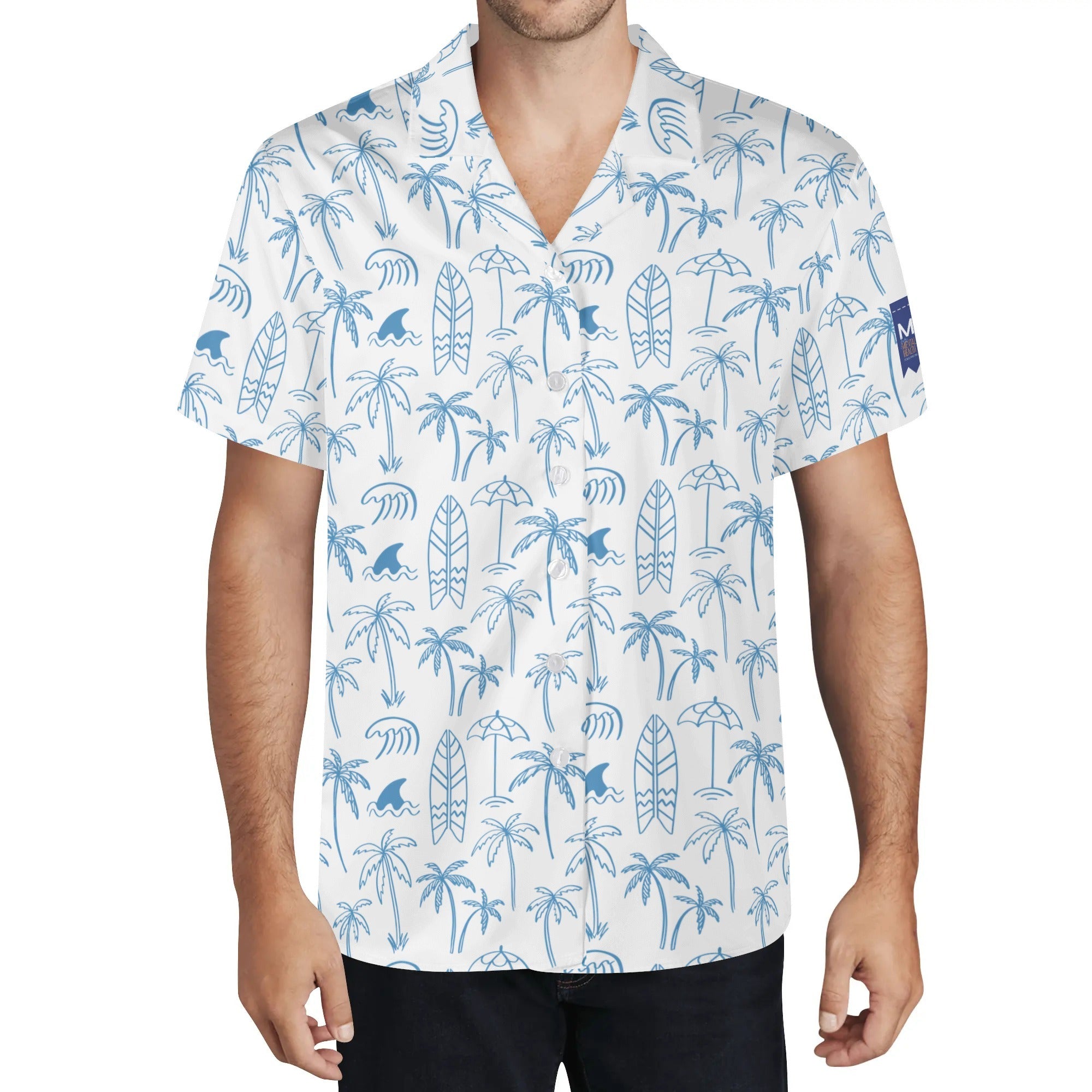 Cool Dad Collection: Men’s Blue and White Surfer Short Sleeve Button Down Shirt with Cuban Collar