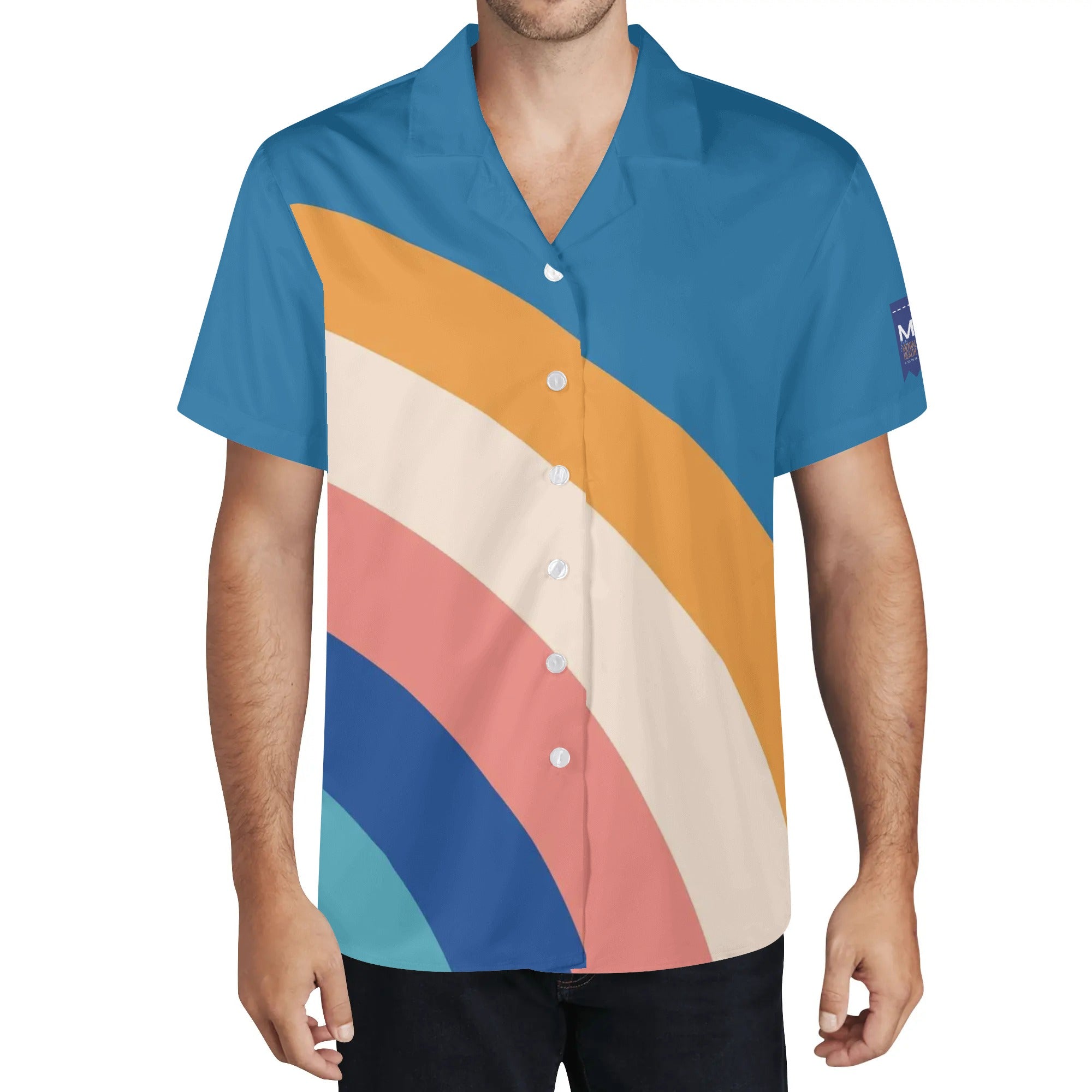 Cool Dad Collection: Men’s Blue Multi-Colored Short Sleeve Button Down Shirt with Cuban Collar