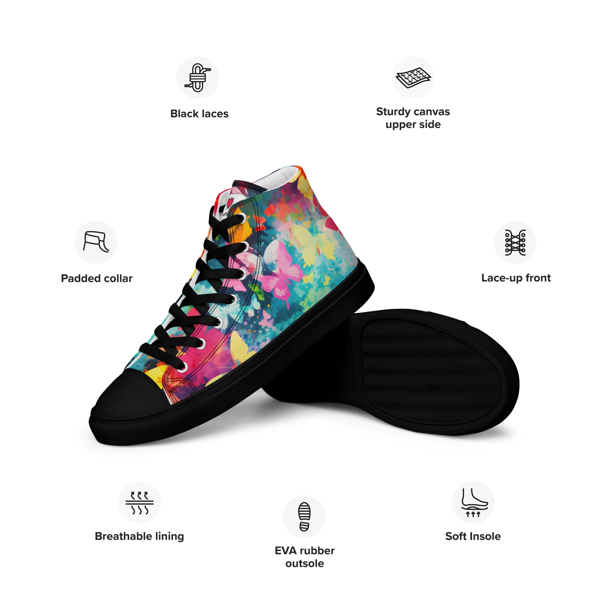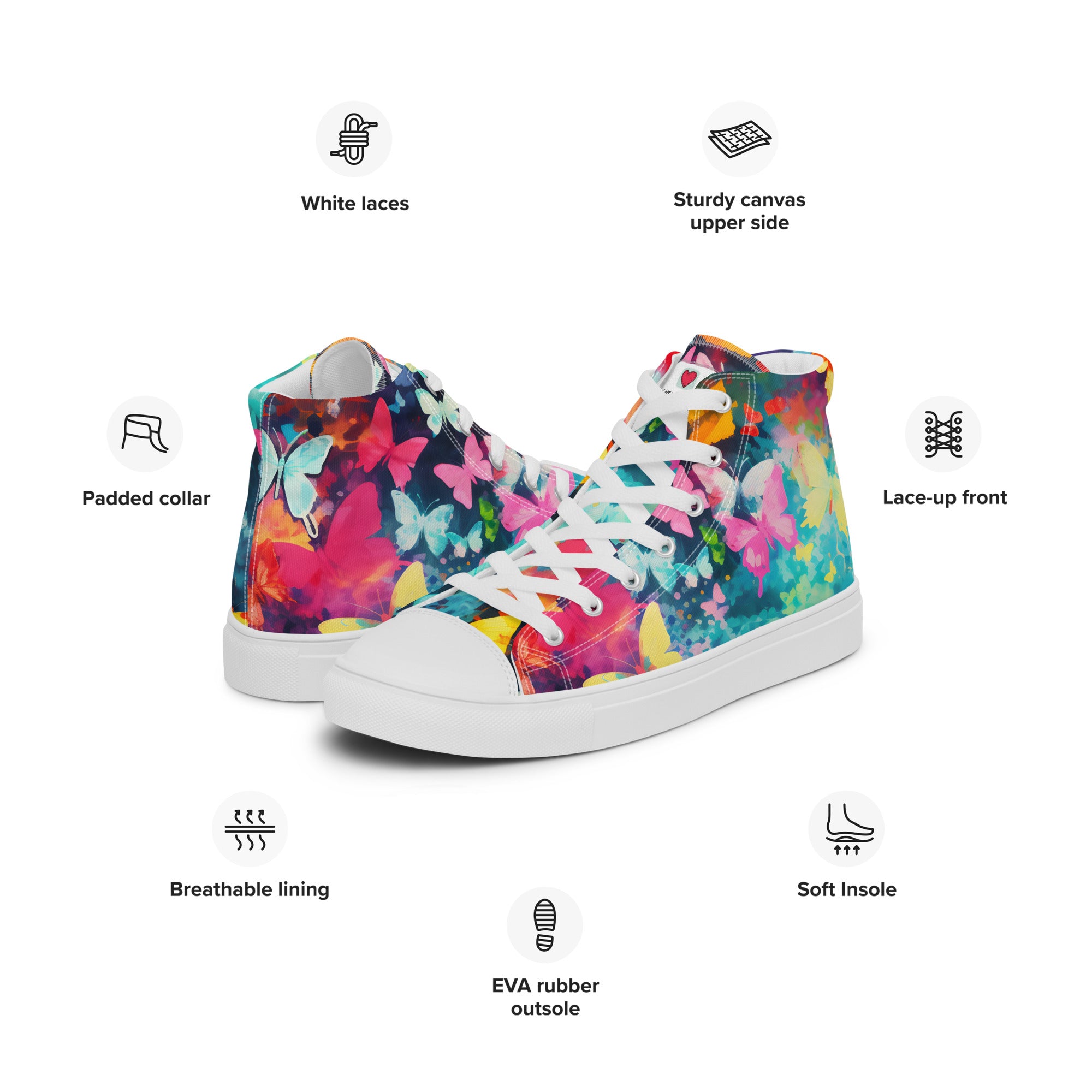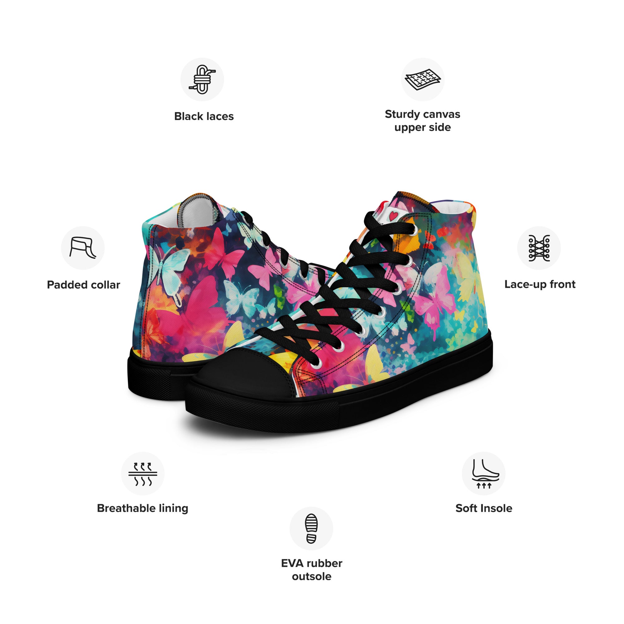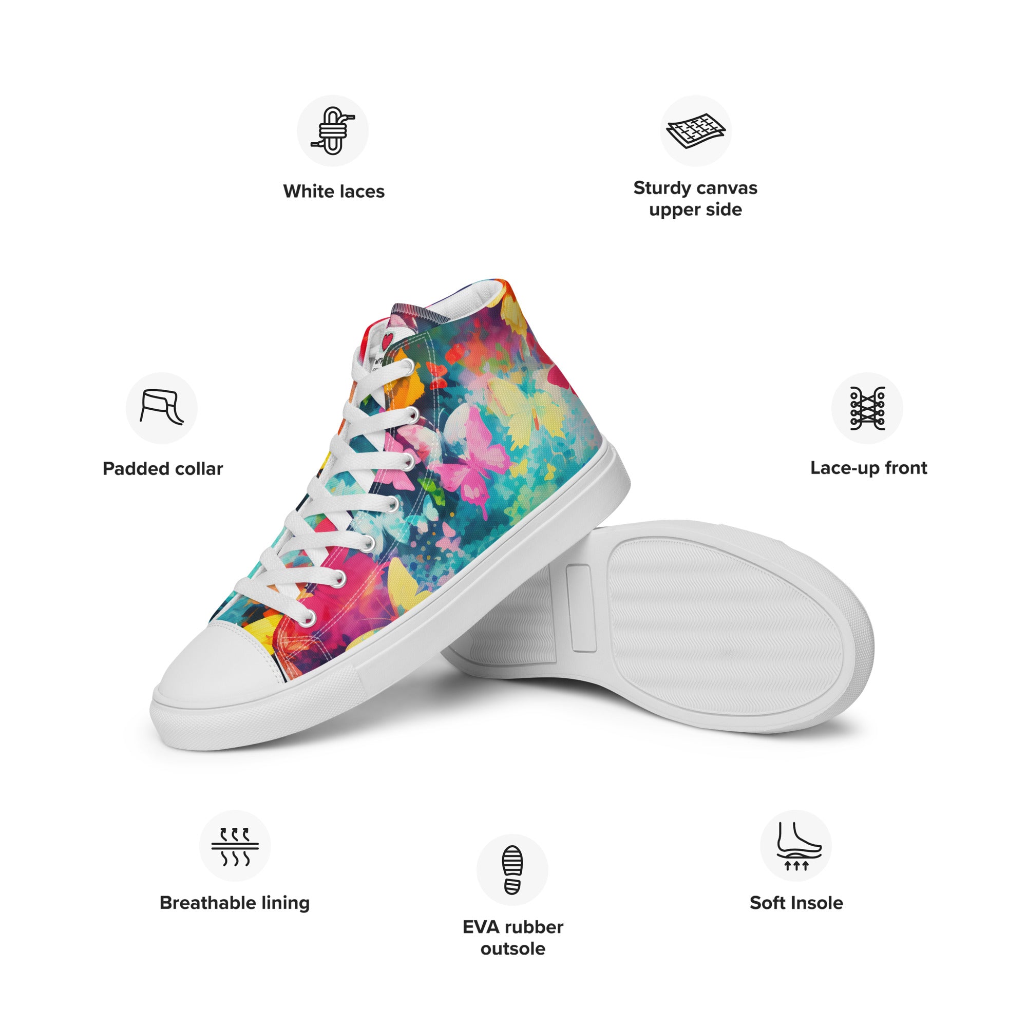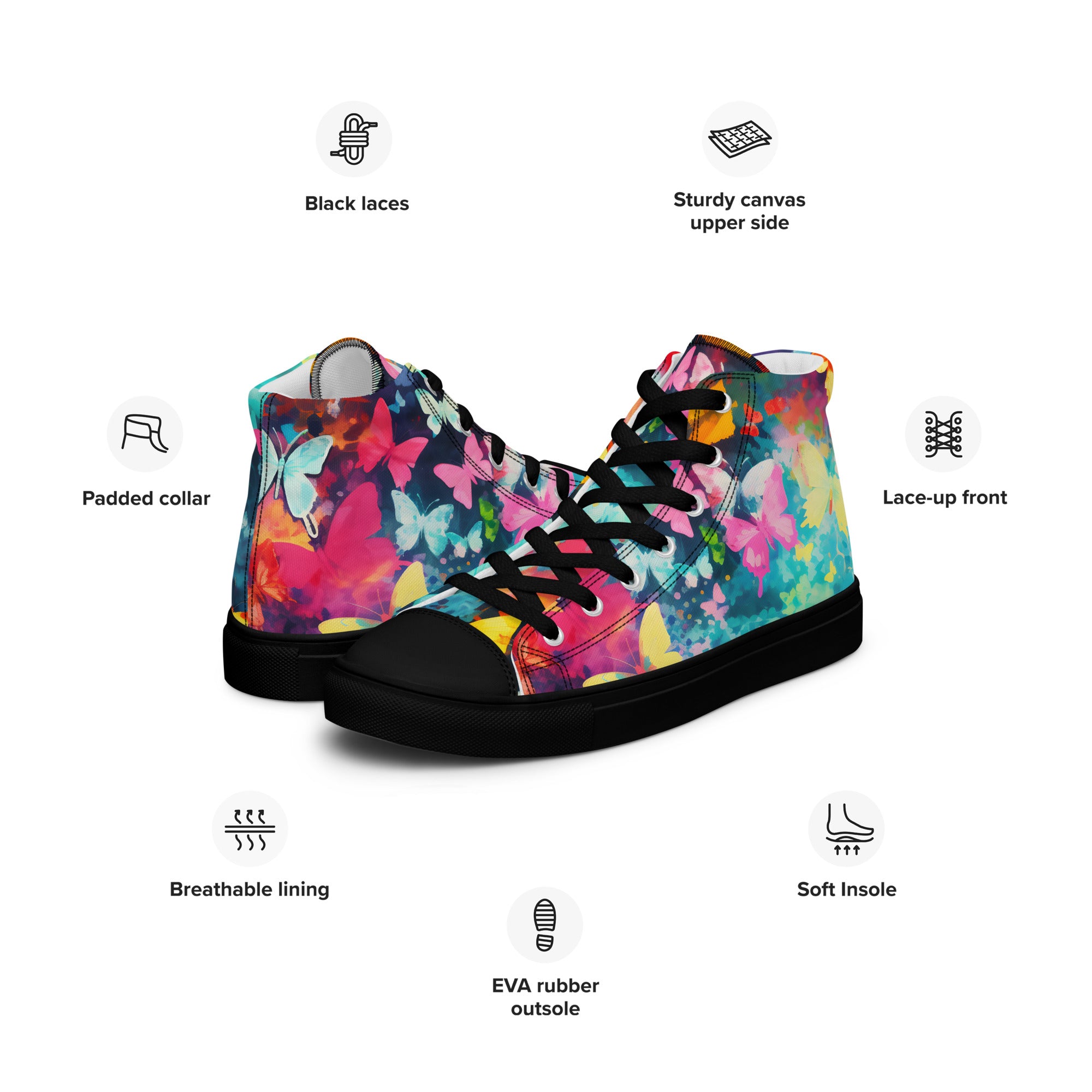Elevate your footwear, embrace the perennial magic of butterflies, and leave a lasting impression. Order your butterfly-inspired high-top canvas shoes today and let the world witness your understated yet profound passion for the timeless beauty of these graceful creatures. Your journey into refined, nature-infused elegance starts here – secure it now!