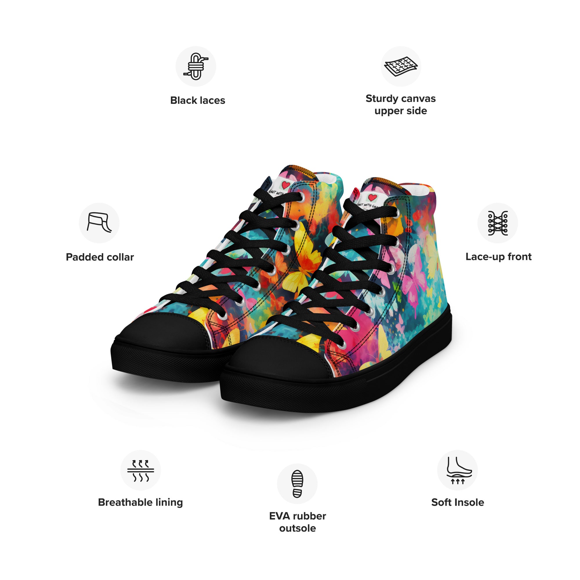 Grit with Grace is not just a store; it's a sanctuary for those who appreciate the delicate beauty of butterflies. These butterfly-inspired high-top canvas shoes are just the beginning. Explore our curated collection to unearth more wonders that resonate with your admiration for the natural world.