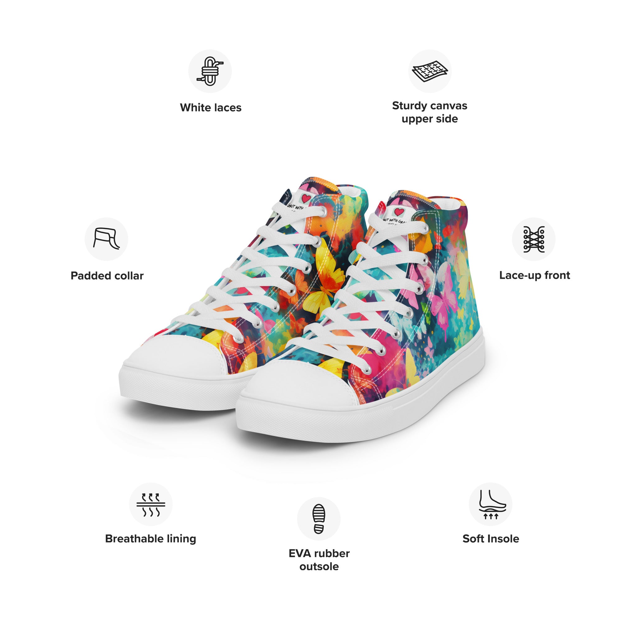Thank you for choosing Grit with Grace, your premier destination for enchanting accessories that effortlessly blend sophistication with the timeless allure of butterflies! We're excited to unveil our latest creation – a butterfly-inspired pair of high-top canvas shoes, designed for those who step into each day with a sense of style and a love for the everlasting beauty of butterflies!