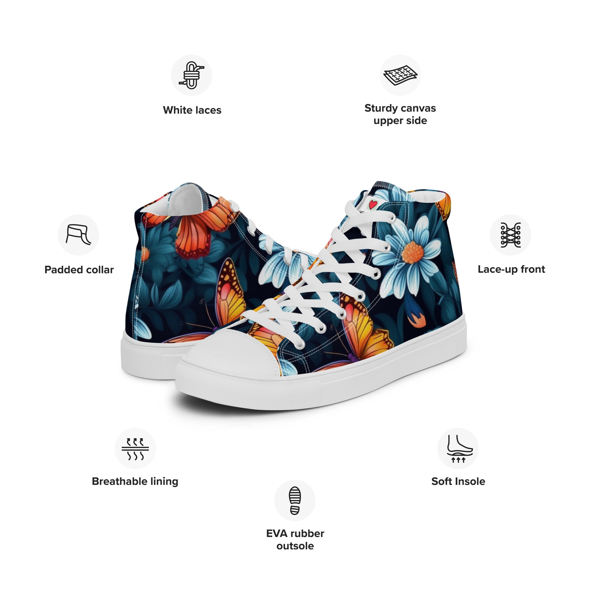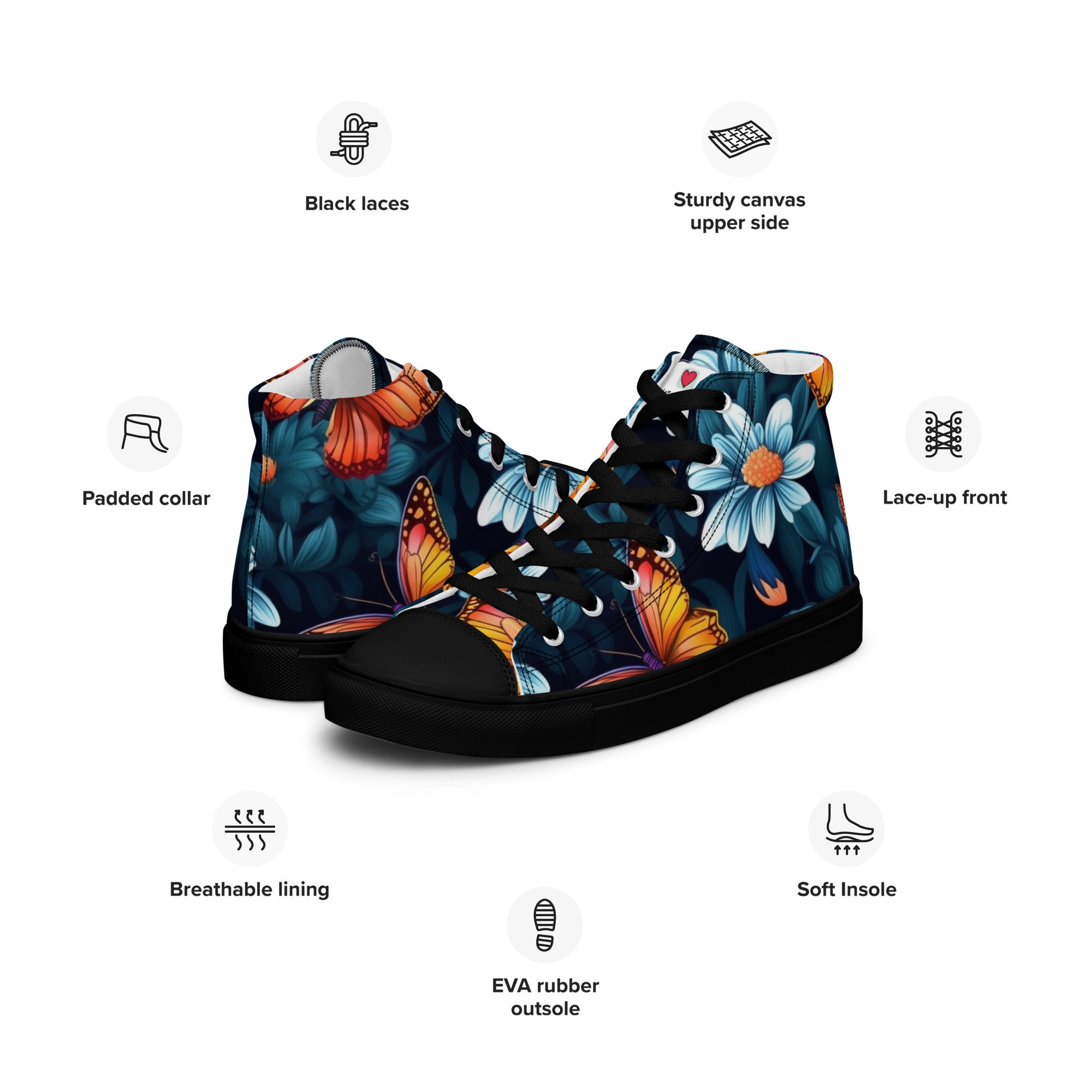 Elevate your footwear, embrace the perennial magic of butterflies, and leave a lasting impression. Order your butterfly-inspired high-top canvas shoes today and let the world witness your understated yet profound passion for the timeless beauty of these graceful creatures. Your journey into refined, nature-infused elegance starts here – secure it now!