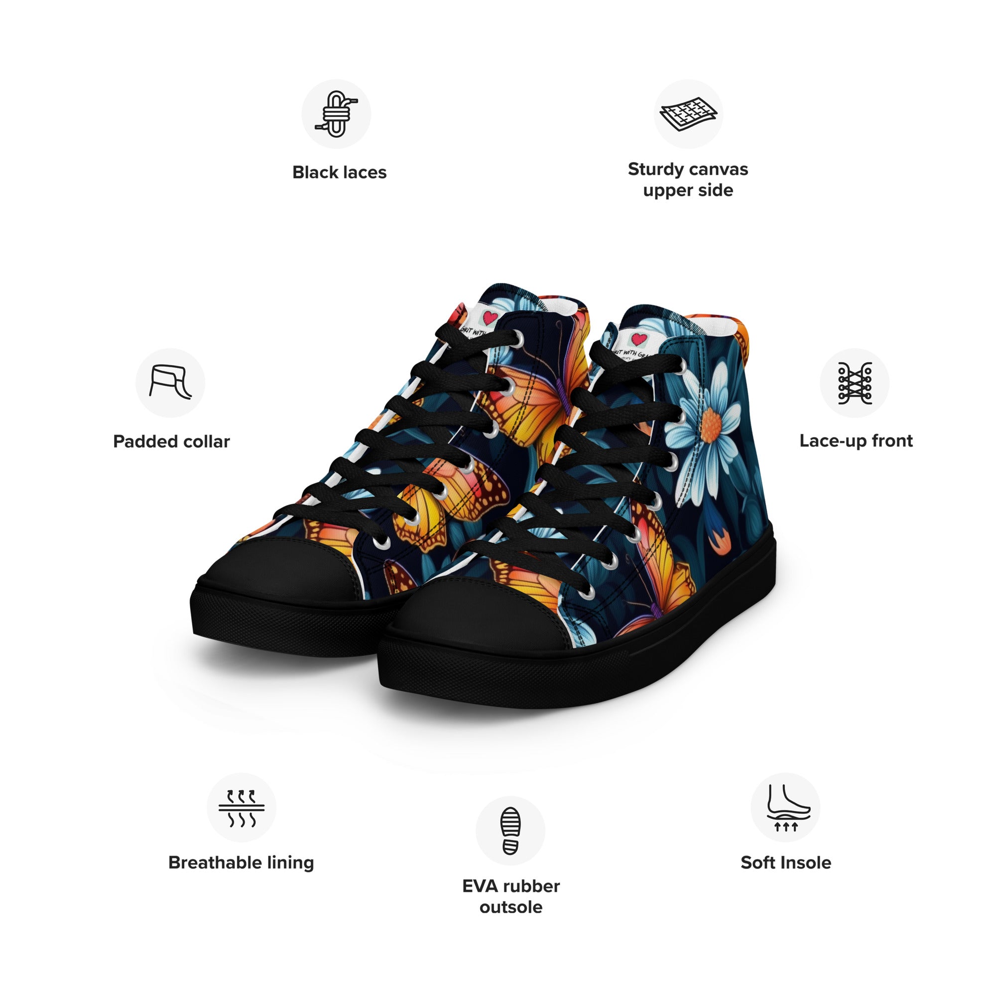 Thank you for choosing Grit with Grace, your premier destination for enchanting accessories that effortlessly blend sophistication with the timeless allure of butterflies! We're excited to unveil our latest creation – a butterfly-inspired pair of high-top canvas shoes, designed for those who step into each day with a sense of style and a love for the everlasting beauty of butterflies!