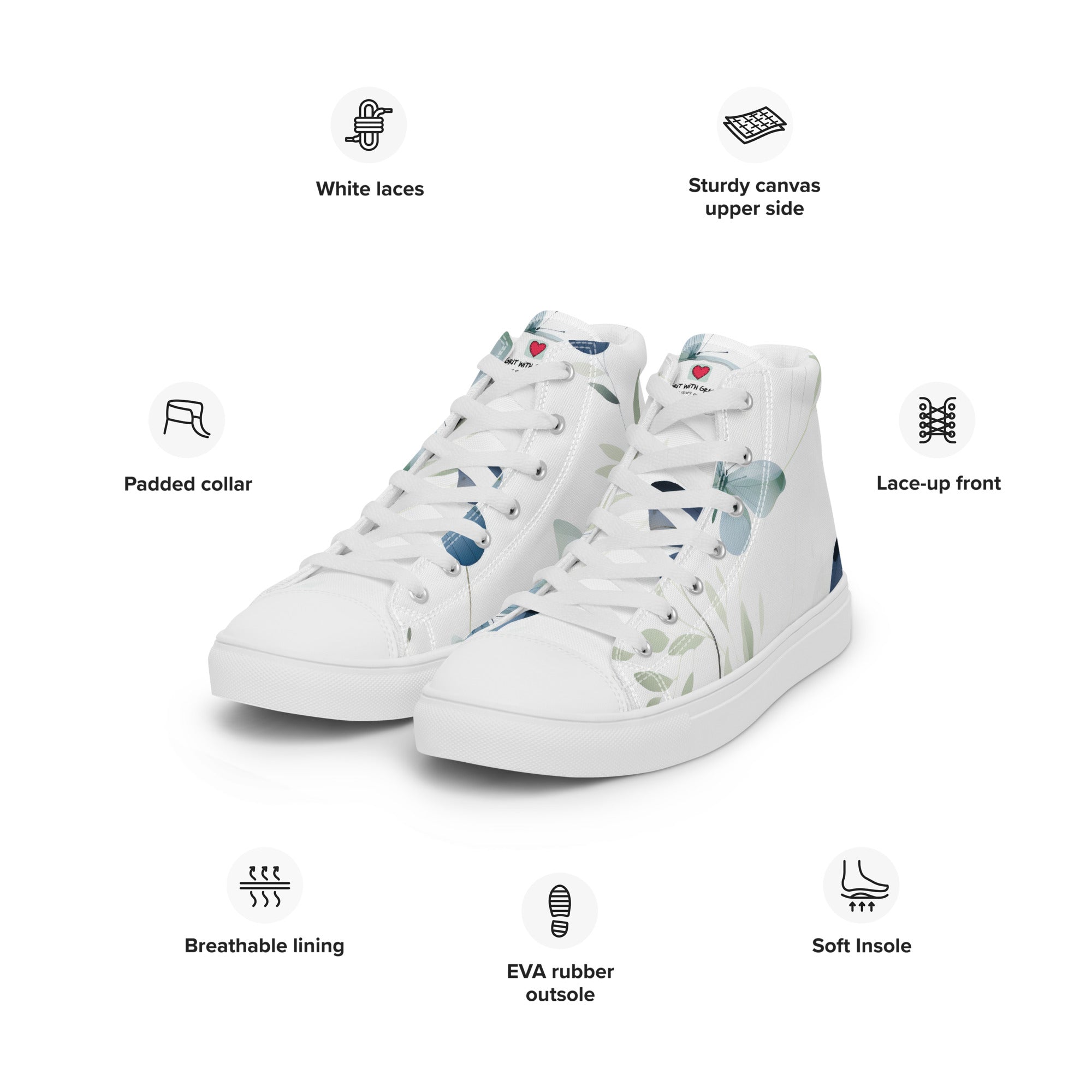 Thank you for choosing Grit with Grace, your premier destination for enchanting accessories that effortlessly blend sophistication with the timeless allure of butterflies! We're excited to unveil our latest creation – a butterfly-inspired pair of high-top canvas shoes, designed for those who step into each day with a sense of style and a love for the everlasting beauty of butterflies!