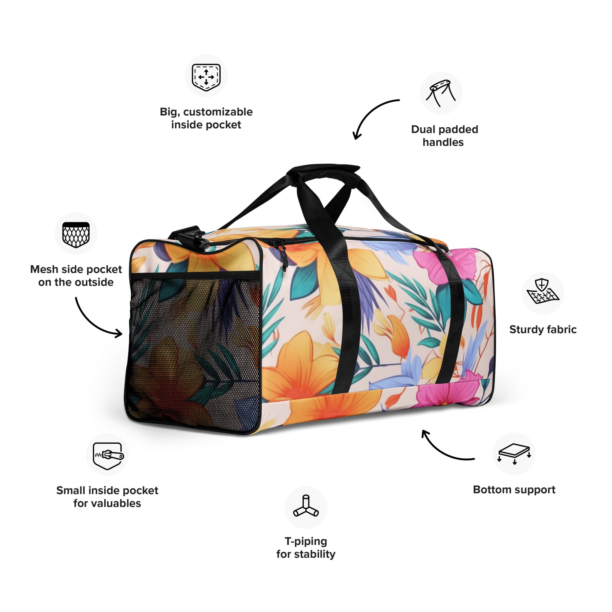 The Bloom Essence Duffle Bag, created with meticulous attention to quality, boasts premium materials that ensure not only visual appeal but also durability. It stands as a testament to our dedication to providing you with accessories that are not only stylish but also reliable companions in your floral-infused adventures.