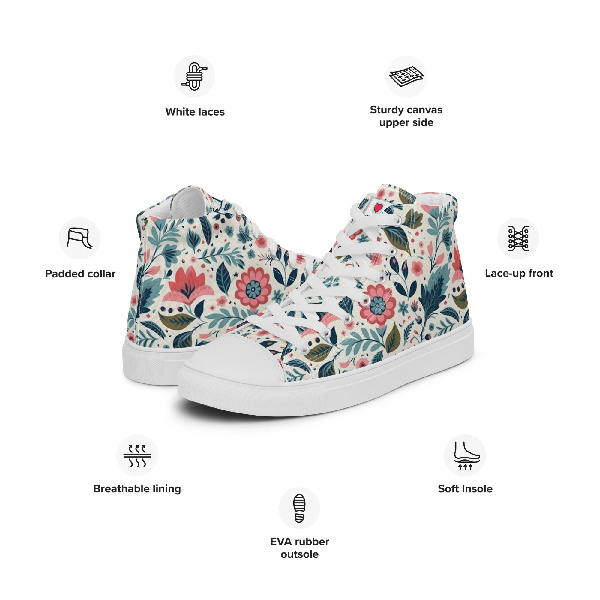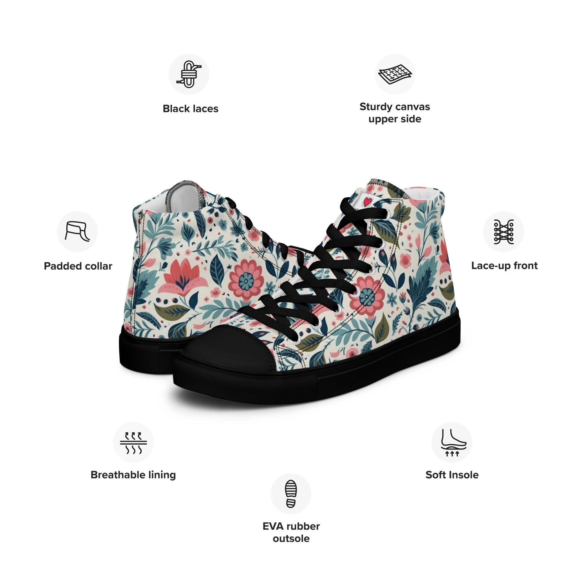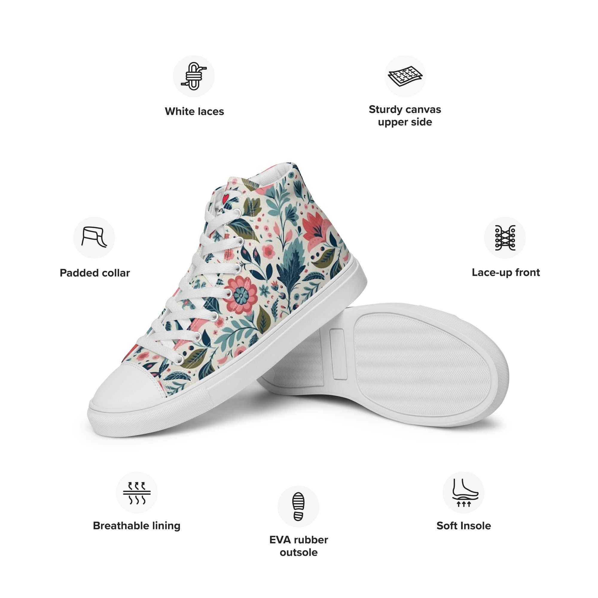 Our high-top canvas shoes, created with meticulous attention to quality, boast premium materials that ensure not only visual appeal but also durability. They stand as a testament to our dedication to providing you with footwear that is not only stylish but also a reliable companion in your floral-infused adventures.