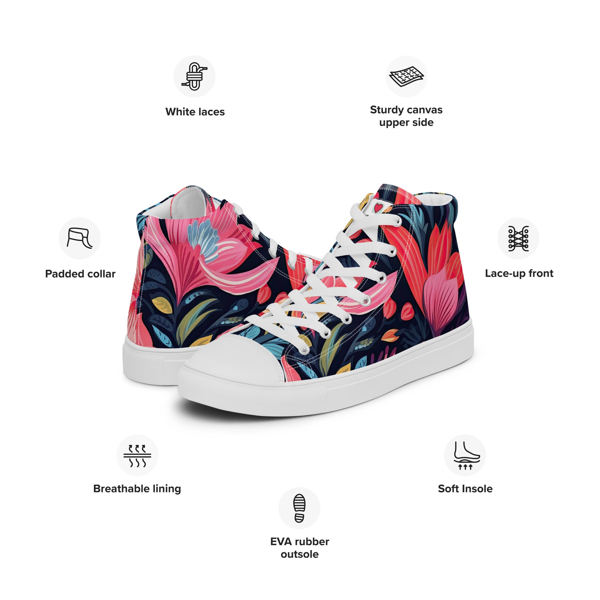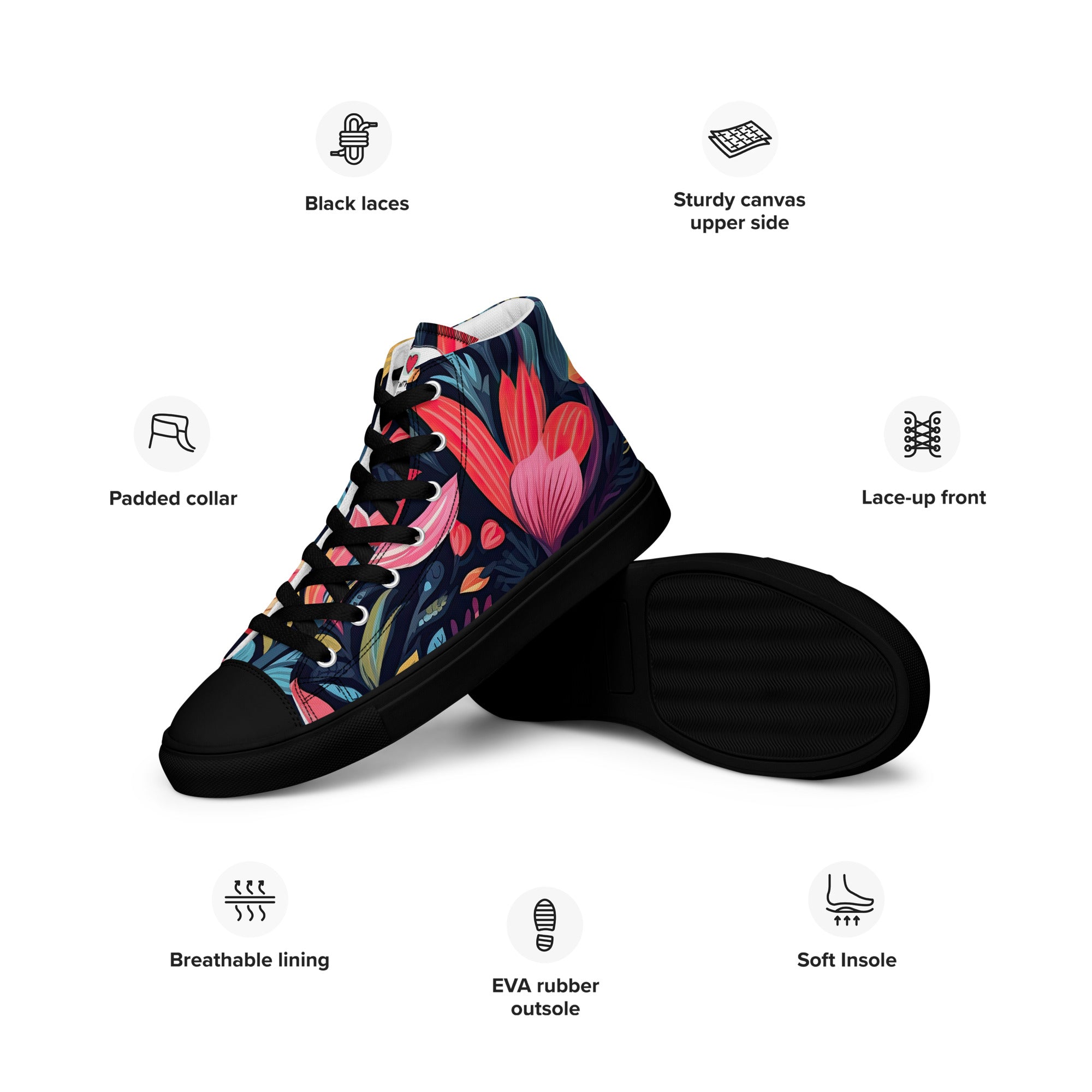 Our floral-inspired high-top canvas shoes, created with meticulous attention to quality, boast premium materials that ensure not only visual appeal but also comfort and durability. They stand as a testament to our dedication to providing you with accessories that are not only stylish but also reliable companions on your floral-infused journeys.
