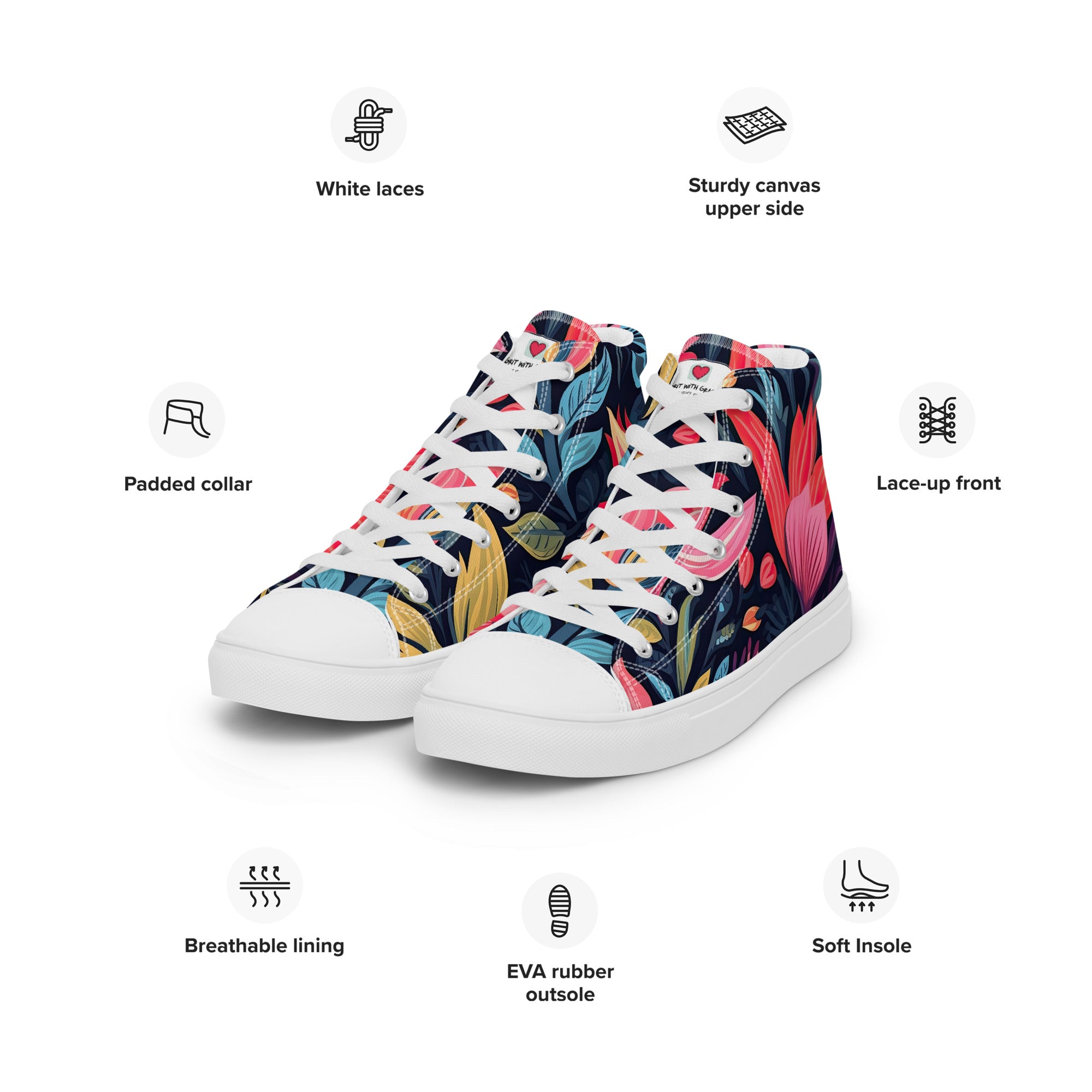 Grit with Grace is not just a store; it's a sanctuary for those who appreciate the delicate beauty of flowers. These floral-inspired high-top canvas shoes are just the beginning. Explore our curated collection to unearth more wonders that resonate with your admiration for the natural world.