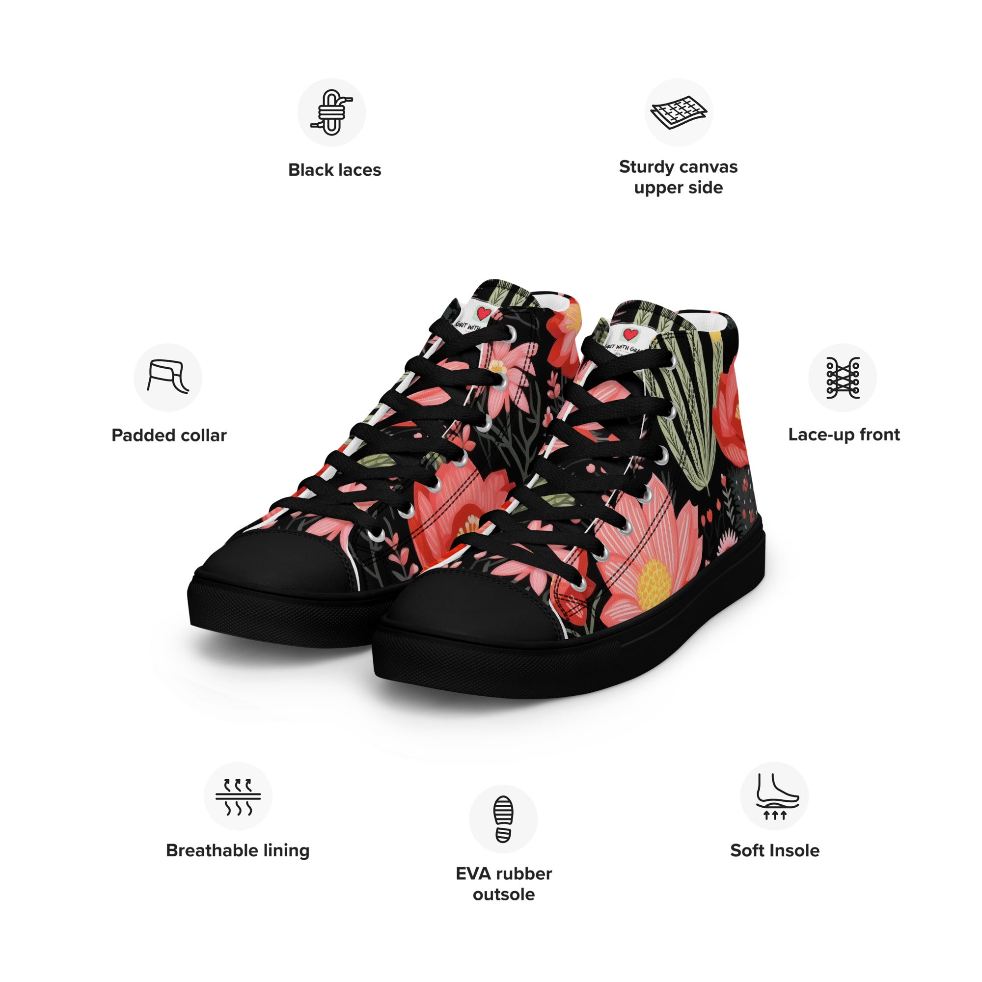 Grit with Grace is not just a store; it's a sanctuary for those who appreciate the delicate beauty of flowers. These floral-inspired high-top canvas shoes are just the beginning. Explore our curated collection to unearth more wonders that resonate with your admiration for the natural world.